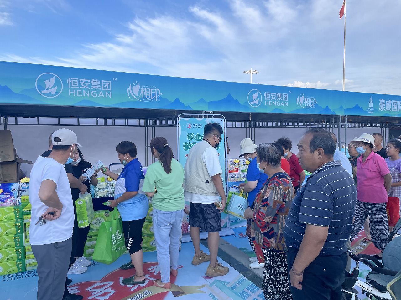 在终点休息处,玛雅吧搭建的心相印产品展示区吸引了许多人的注意。只要购买心相印产品,就能参与抽奖,跑者、游客都蜂拥而至,聆听导购员的介绍,认真选购产品。